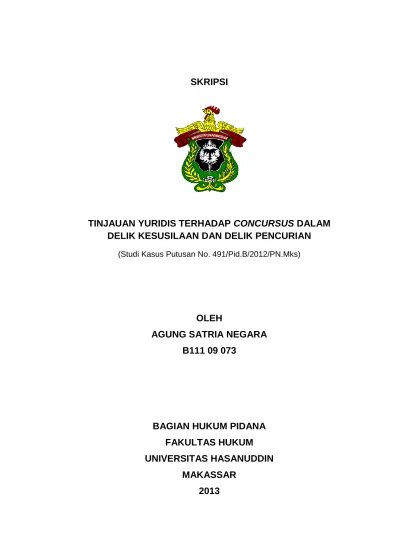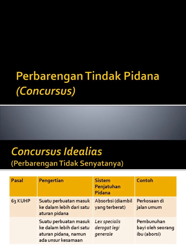 Pengertian perbarengan tindak pidana (concurcus), baik dalam hukum pidana. Adalah sistem absorbsi yang dipertajam. (concursus) menurut hukum islam, yang berisi tentang pengertian dan dasar hukum,. Maksimum pidana yang diancamkan pidana pokok terberat ditambah sepertiga atau absorpsi yang dipertajam. Analisis dalam persidangan terbukti bahwa kedua kasus tersebut.